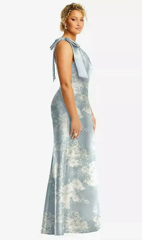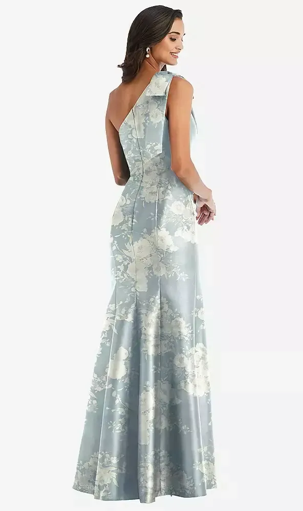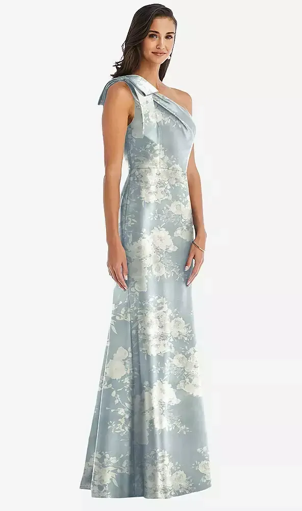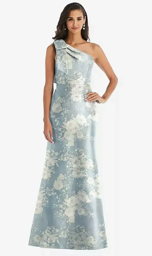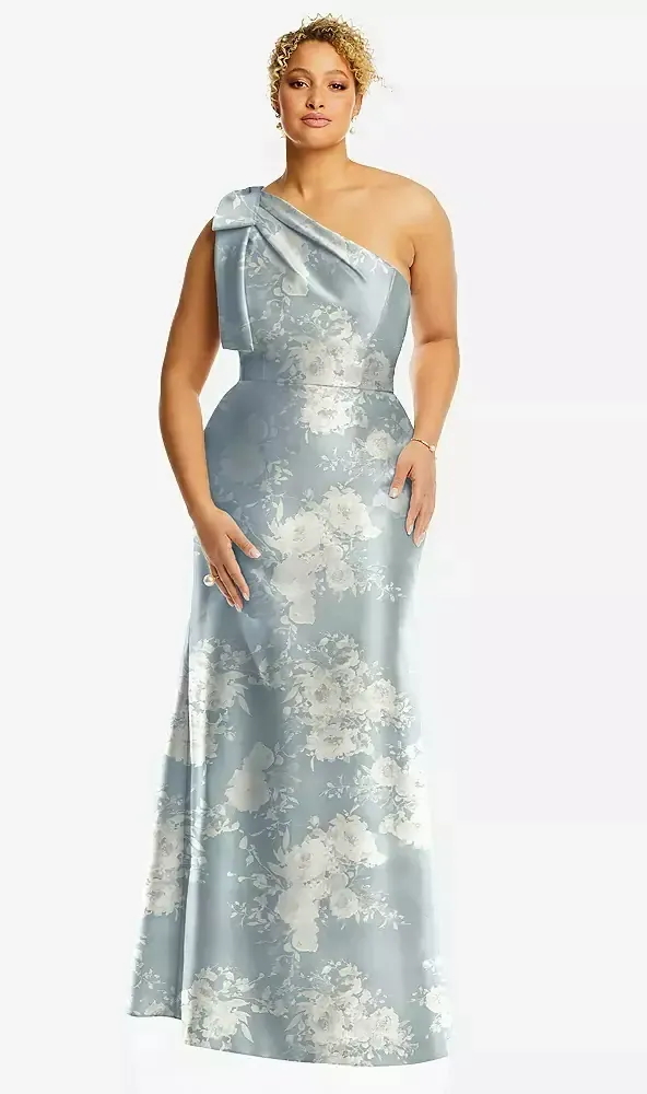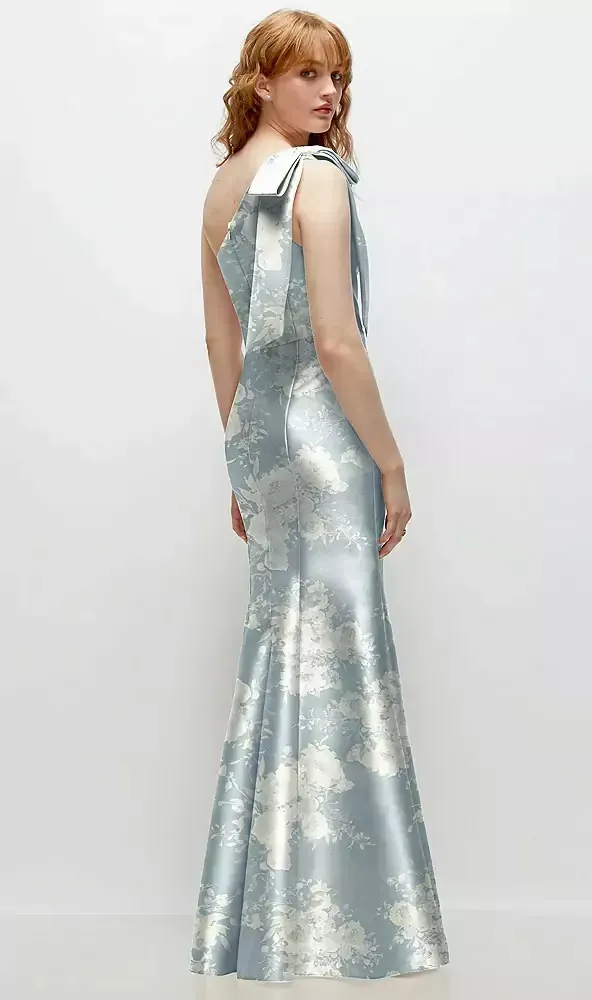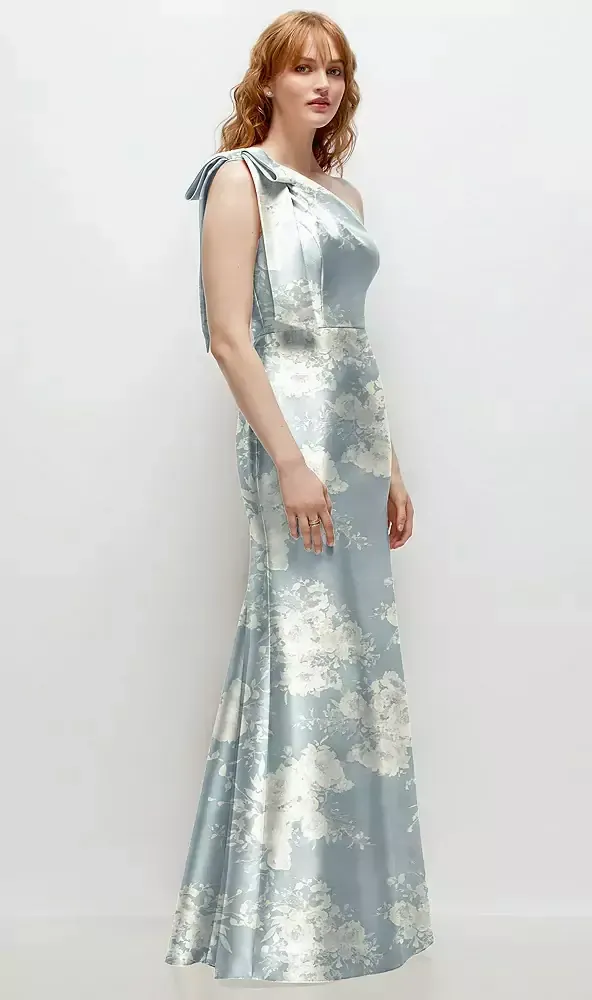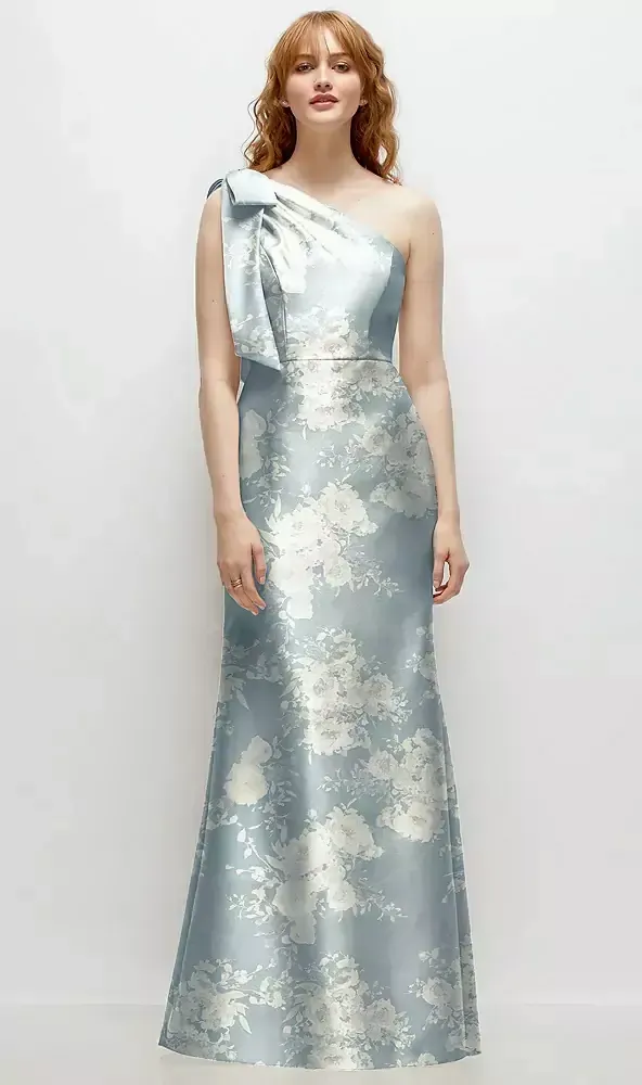 Asymmetrical and chic, this floor-length floral maxi dress is made of a smooth satin twill and offers a sophisticated touch for special occasions. With a revealing one-shoulder bodice with a regal oversized bow detail, this floral satin twill maxi dress flows into a flared trumpet skirt.
