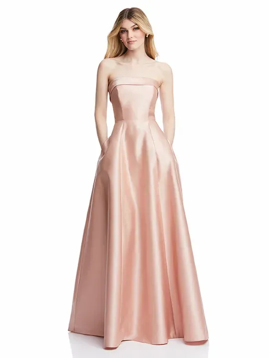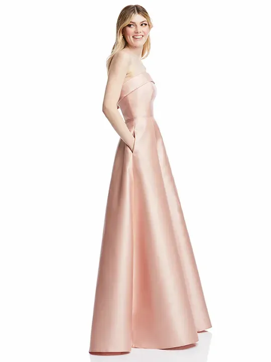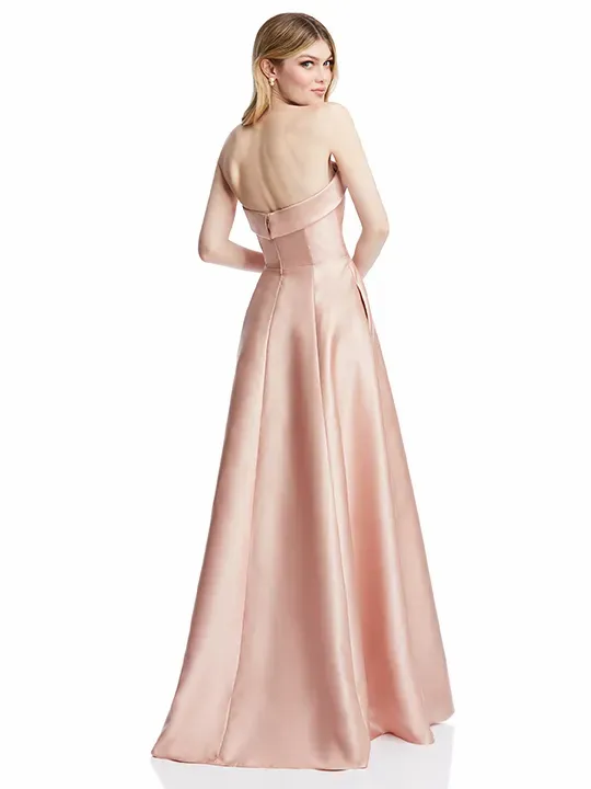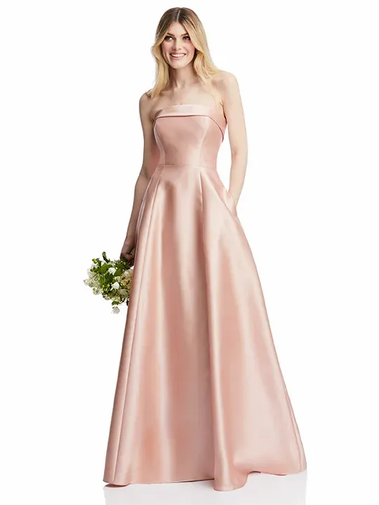 This stunning strapless satin twill maxi dress exudes sophistication with an elegant bias cuff neckline. You'll feel like a princess as you twirl across the dance floor in this gorgeous gown. Its full modified circle skirt with hidden pockets adds a ball gown air that is chic and timeless with a nod to a past era.
