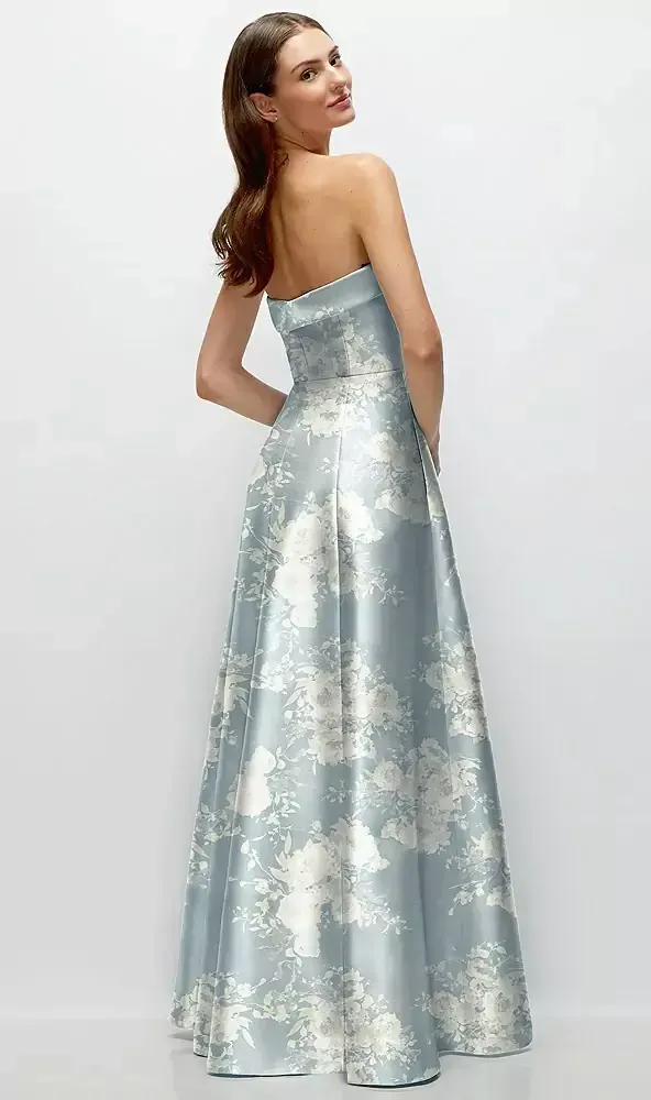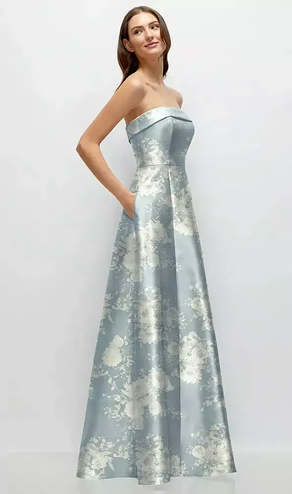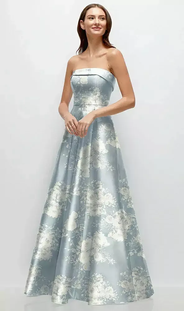 This enchanting strapless floral satin twill maxi dress exudes classic charm with an elegant bias cuff neckline. You'll feel like a princess as you twirl across the dance floor in this gorgeous gown. Its full modified circle skirt with hidden pockets adds a ball gown air that is romantic and timeless with a nod to a past era.