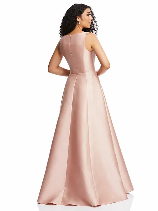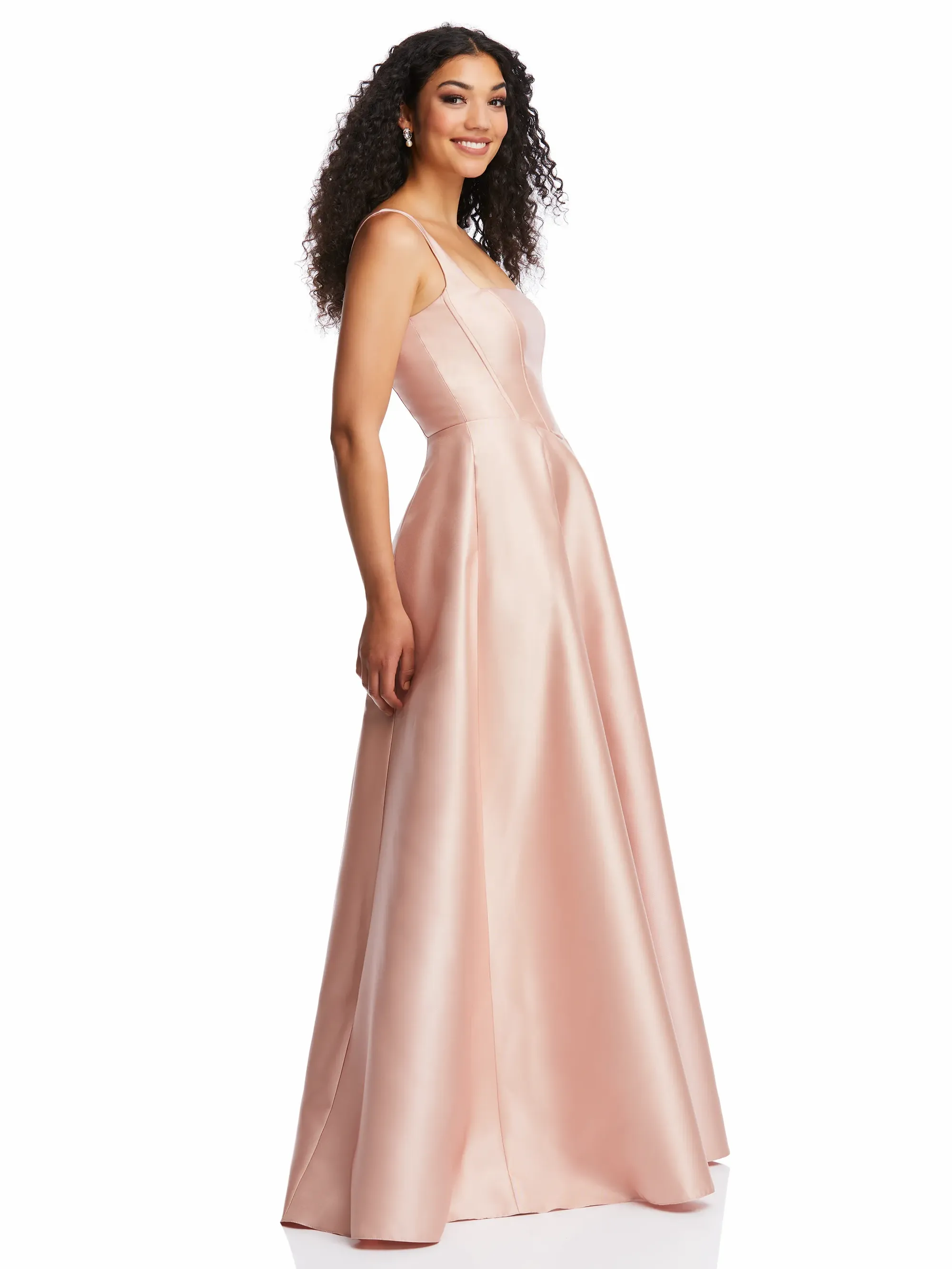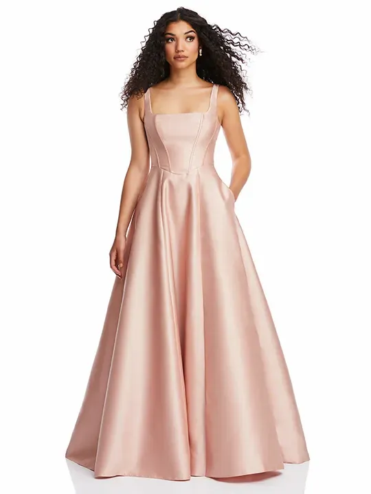Classic lines and alluring details define this striking satin twill maxi dress. Its chic boned corset bodice features an open square neckline and full closed back, which flows into a full skirt with convenient pockets. Choose this gown for your bridal party or turns heads at an evening cocktail party.