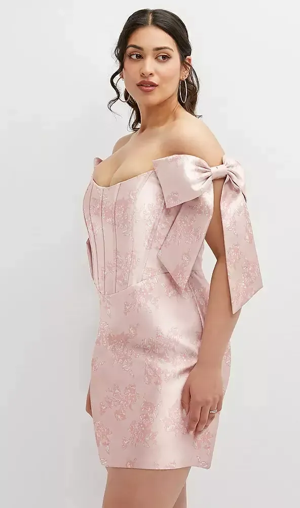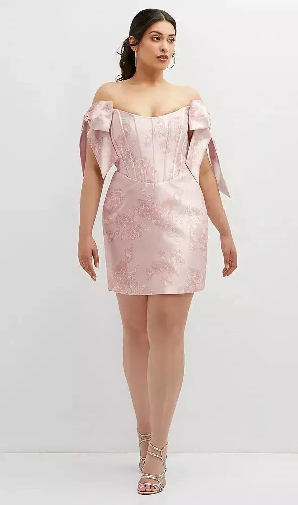 Embrace the sassy style of a mini dress with a chic style, perfect for a daytime wedding. Bridesmaids glow with beauty in this Satin Twill print dress with a Basque neckline and a fitted corset bodice. A fixed off-shoulder bow detail delivers a stunning, flowy look.