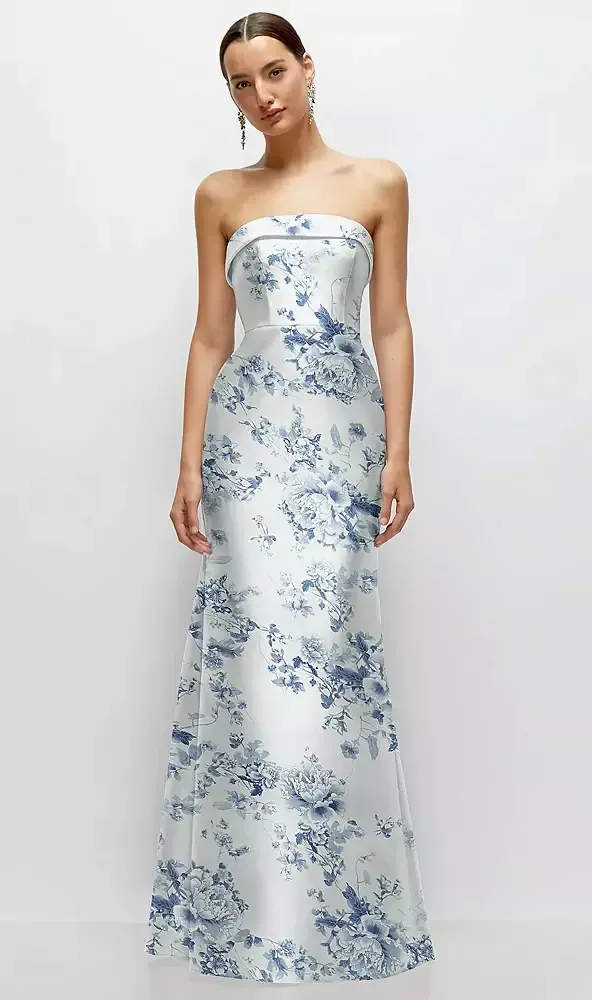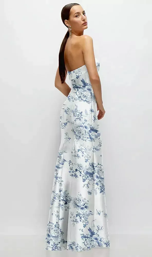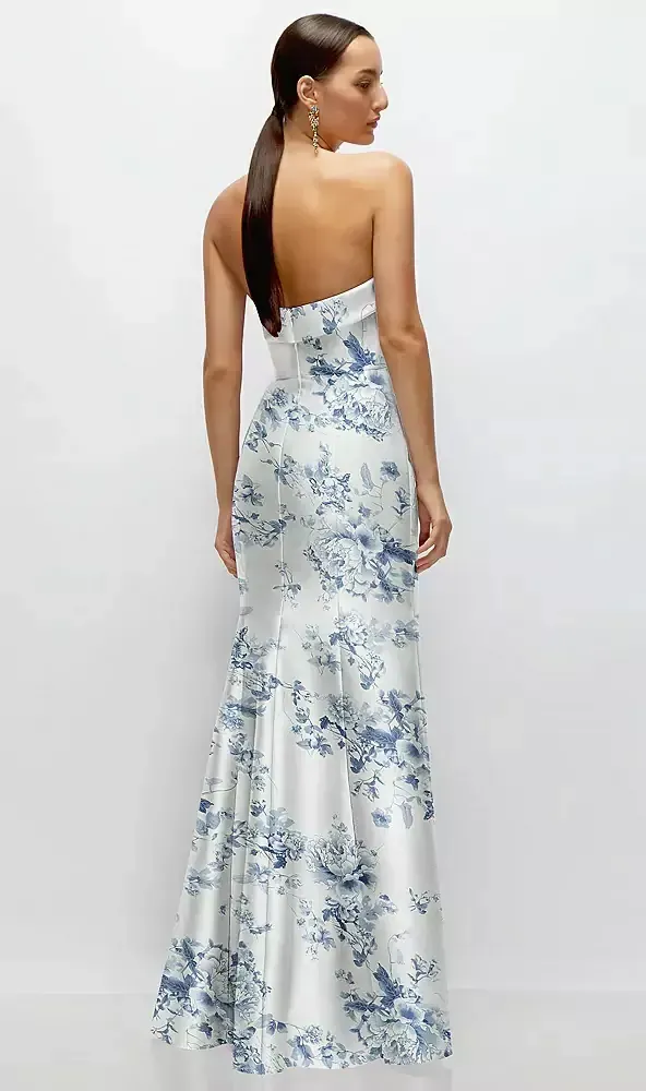 This floral satin twill maxi dress is effortlessly chic, featuring a strapless design with a sleek cuff detail at the neckline. The soft trumpet skirt gives it a graceful vibe, and the floral print adds a fresh twist. It's perfect for a modern, trendy look, blending timeless elegance with a playful touch.