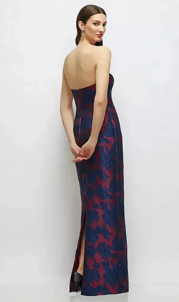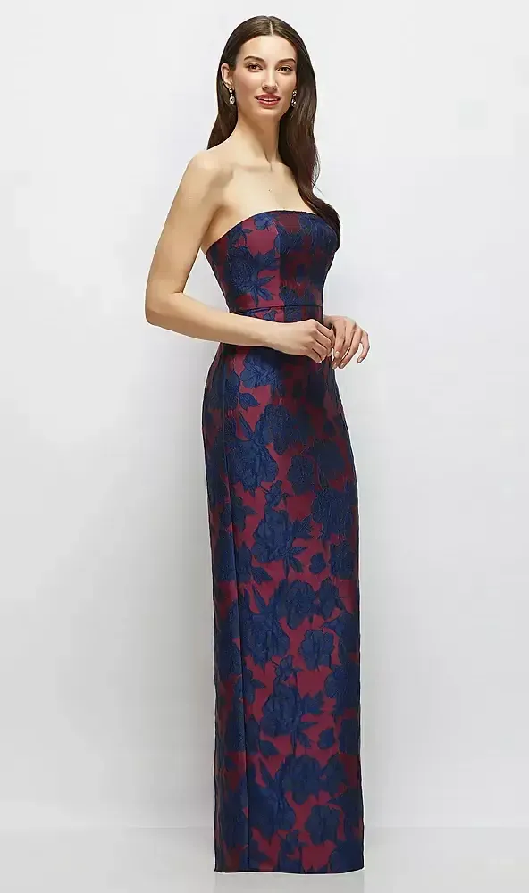 Serving sleek sophistication with a vibrant twist, this strapless maxi dress brings bold energy in a decadent Heritage Floral Jacquard. Striking navy blooms pop against a rich burgundy backdrop, creating a statement look that's confidently chic. Designed with a figure-flattering column silhouette and a subtle center-back slit, it effortlessly blends timeless glam with modern vibes.