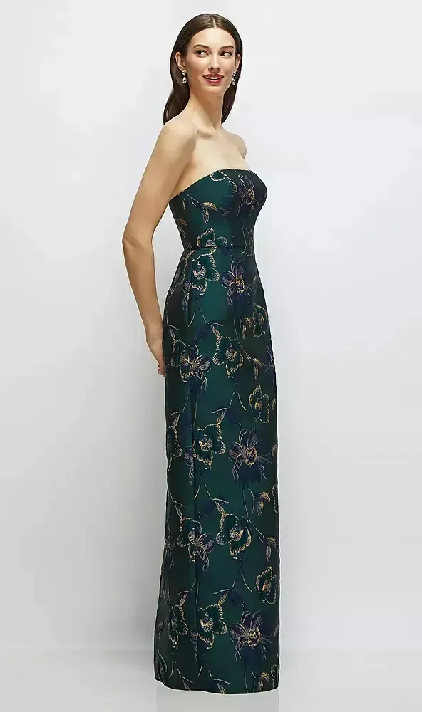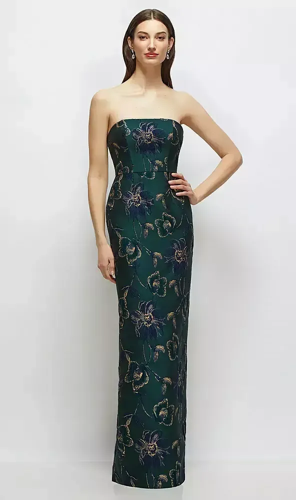 Turn heads in this opulent Oscar Metallic Floral Jacquard strapless maxi dress, where shimmering navy blooms kissed by golden metallic accents pop against a rich evergreen backdrop. The sleek column silhouette adds an effortlessly luxe feel, while the center-back slit gives a subtle spark of drama with every step. This dark floral dress is boldly chic, undeniably glam, and totally unforgettable.