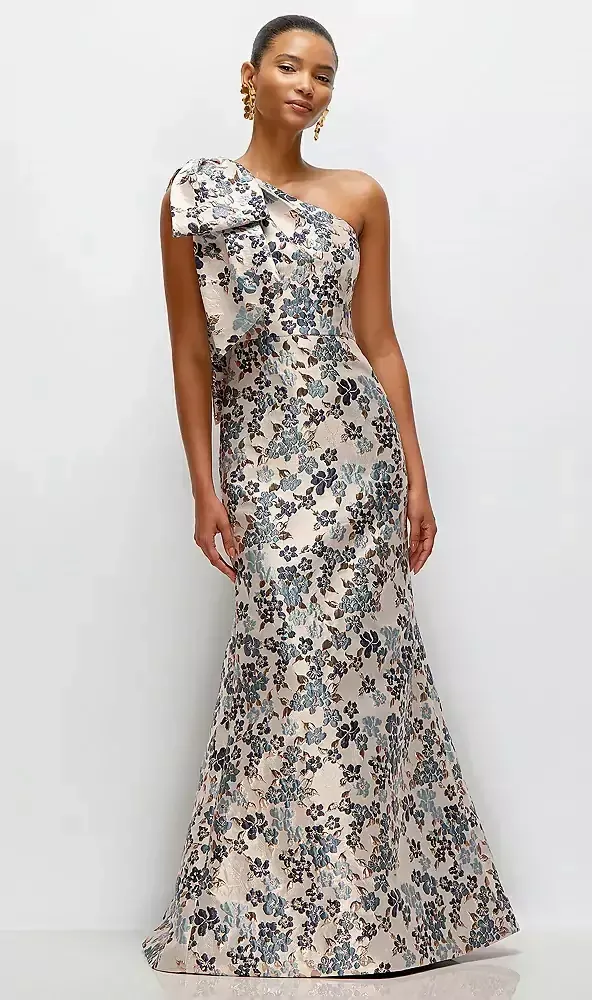 This ultra-chic gilt indigo brocade one-shoulder dress is pure luxury. The rich indigo and navy blue florals are intricately woven among rose gold leaf accents, creating a stunning contrast against the lustrous, light backdrop that glimmers with every move. The oversized bow at the shoulder adds a chic pop to this opulent design, while the soft trumpet skirt flows effortlessly into a slight sweep train with a 1-inch horsehair hem for a crisp edge. This gilded indigo and navy blue floral maxi dress is a true showstopper, making you shine without even trying.