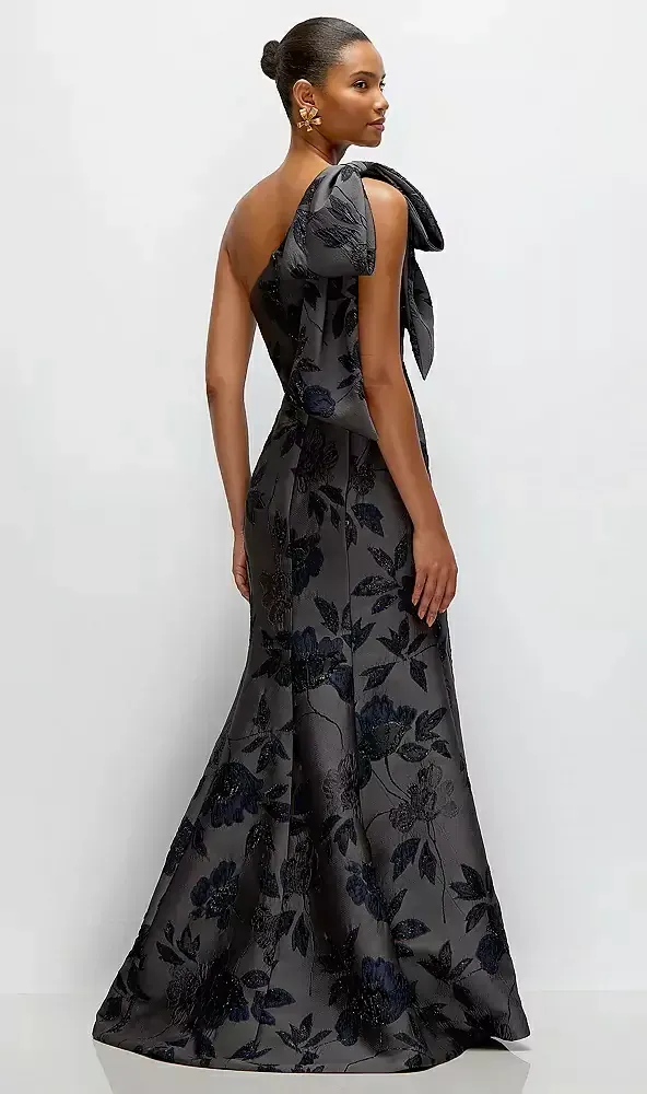 This striking one-shoulder dress dazzles in a dramatic midnight navy and black metallic jacquard. The luxe textured florals with metallic accents shimmer as you move, creating a captivating contrast between the deep navy and rich black tones. The oversized bow at the shoulder adds a chic, modern vibe, while the flattering soft trumpet skirt flares into a slight sweep train with a 1-inch horsehair hem for a crisp, polished edge. This black and navy metallic floral maxi dress is a flawless blend of glam and drama, ideal for making a stunning statement.