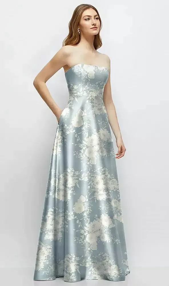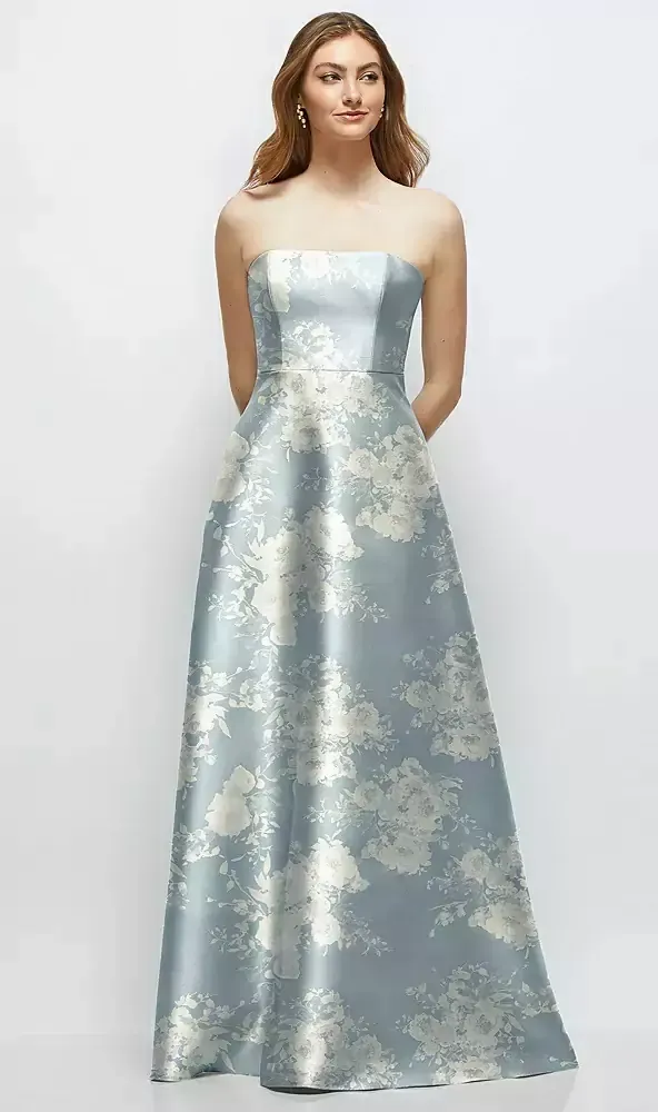 Meet the strapless satin twill gown that's vintage romance remixed for right now. Crafted from lush floral satin twill, the dress has a timeless silhouette elevated by soft blooms scattered delicately across a luminous backdrop. The sleek bodice transitions effortlessly into a full skirt with hidden pockets—chic convenience meets dreamy design. Covered buttons trail gracefully down the back to the natural waist, adding that modern finishing detail you're craving. This floral maxi dress is classic, feminine, and entirely fresh—the perfect pick for moments meant to feel beautifully unforgettable.