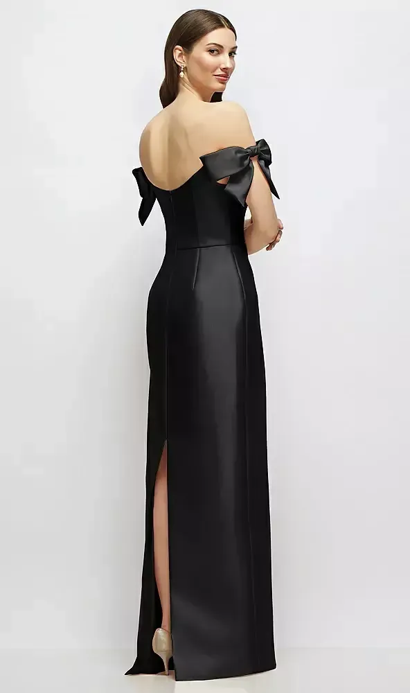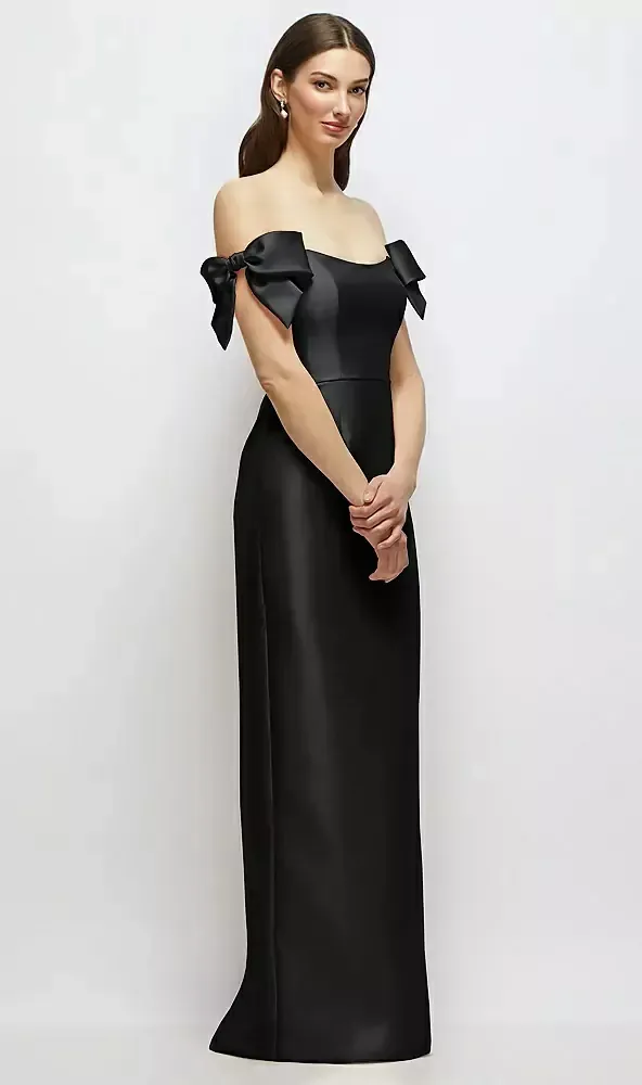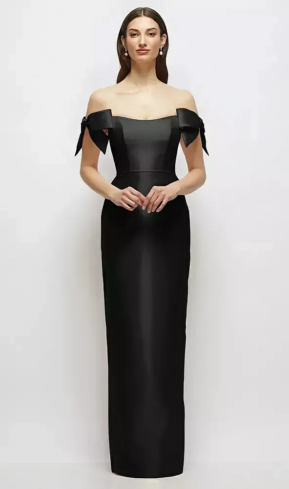 This dreamy column gown serves effortlessly chic energy in soft, luminous satin twill. With a beautiful basque neckline highlighting your collarbones and playful pre-tied bows draping off-the-shoulder, this maxi dress masters romantic charm with a hint of fresh sophistication. A sleek center-back slit brings a subtle spark of drama, giving you room to move with confidence. Think polished, poised, and undeniably captivating—this sleek satin dress sets the stage for making unforgettable memories.