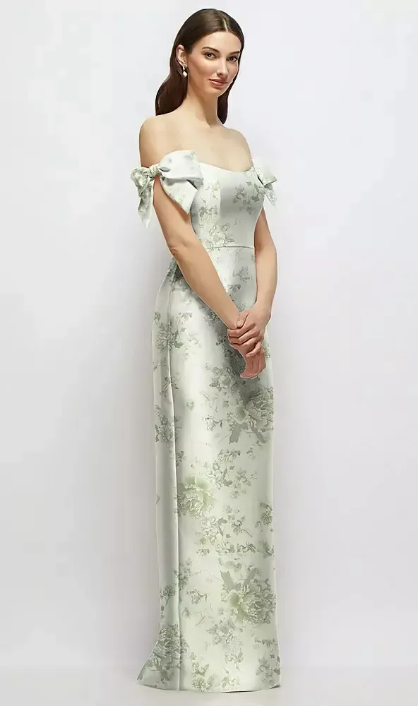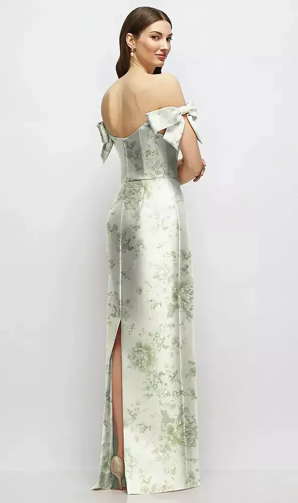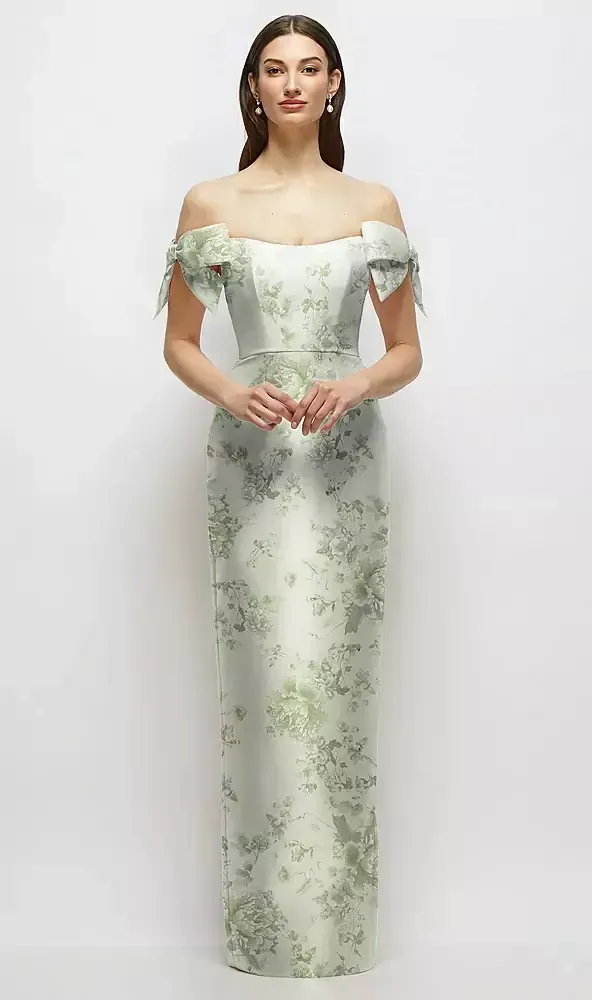 Fresh blooms meet sleek sophistication in this captivating floral satin twill column dress. A beautiful basque neckline frames your collarbones, while delicate pre-tied bows softly cascade off the shoulders, enhancing its romantic yet chic appeal. The minimalist silhouette is elevated by a sleek center-back slit, giving you room to move with confidence. Adorned with garden-inspired botanicals that lend a timeless yet modern feel, this floral maxi dress is polished, poised, and effortlessly enchanting—ready to create standout moments.