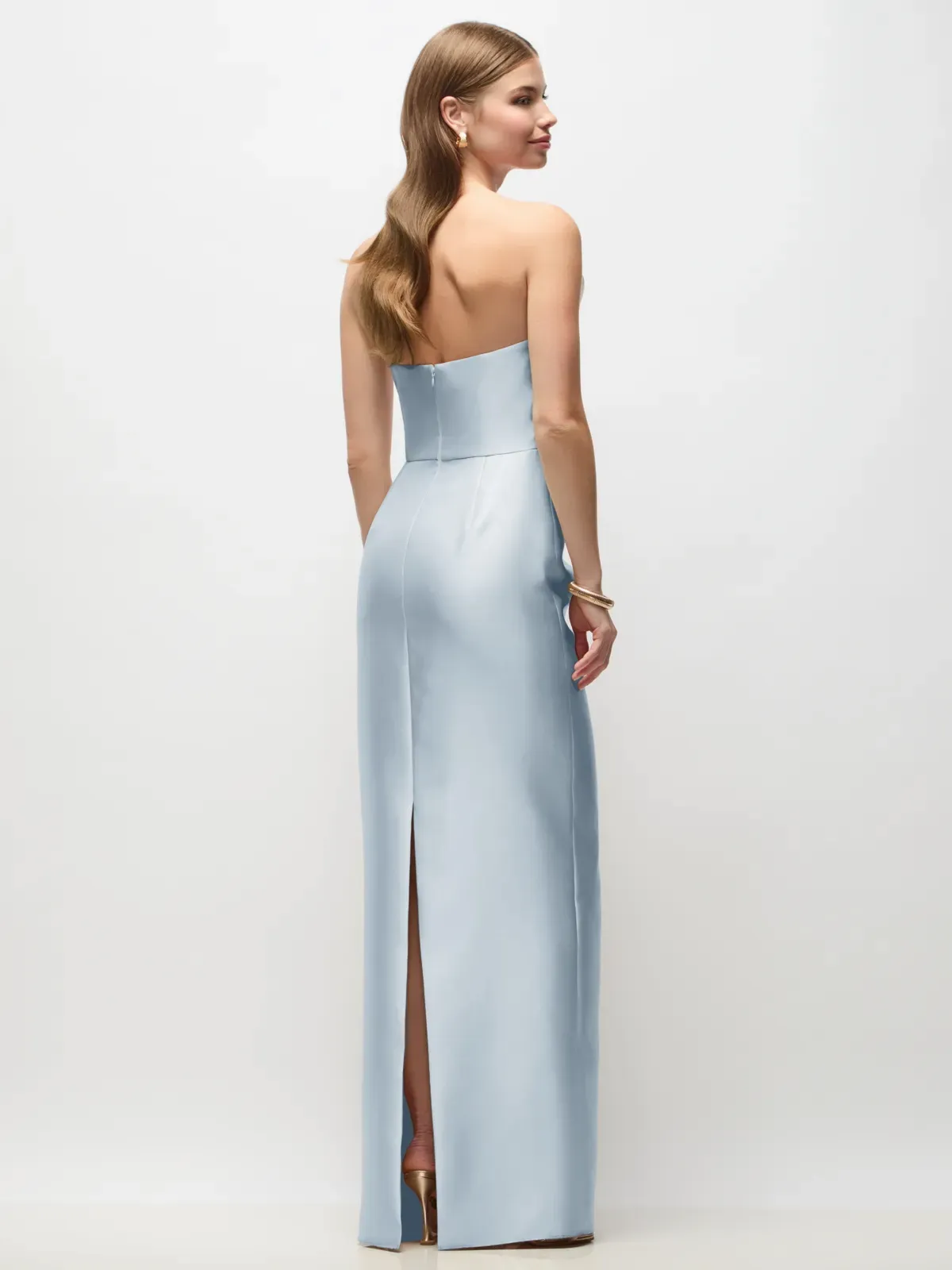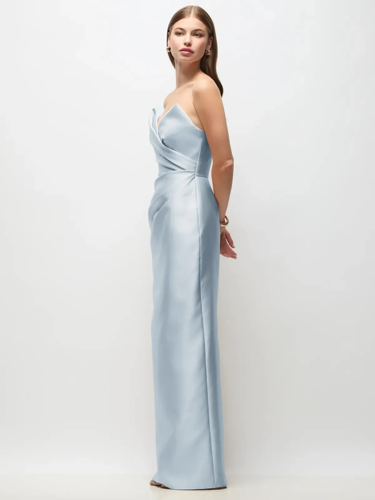 Meet a stunning satin maxi dress that blends chic sophistication and modern glamour. Crafted with flattering sculptural pleats radiating from one side, the strapless faux-wrap bodice sweeps beautifully into a sleek column skirt. Our smooth, luminous satin twill fabric adds a luxe glow, ready to illuminate every memorable moment. This captivating column maxi dress delivers a silhouette that's both striking and effortlessly poised.