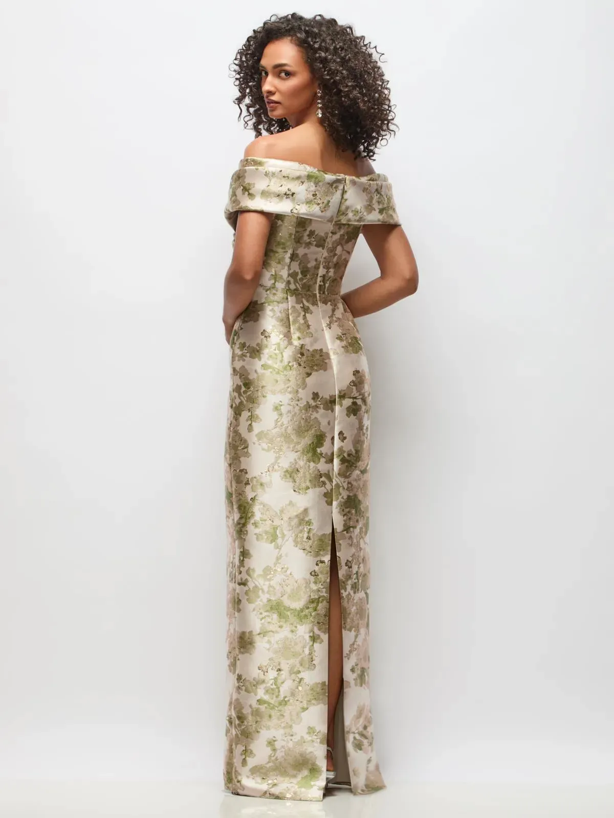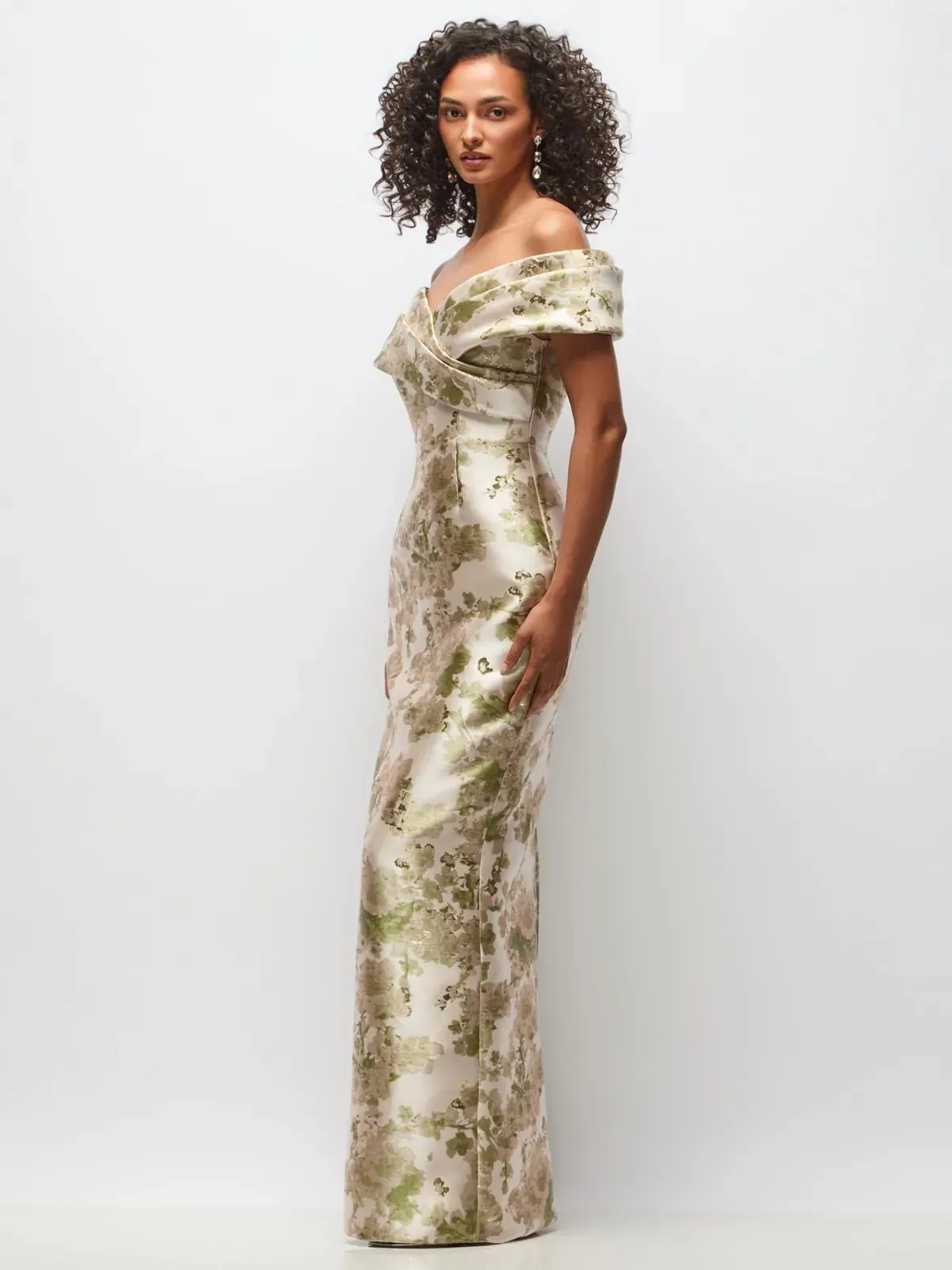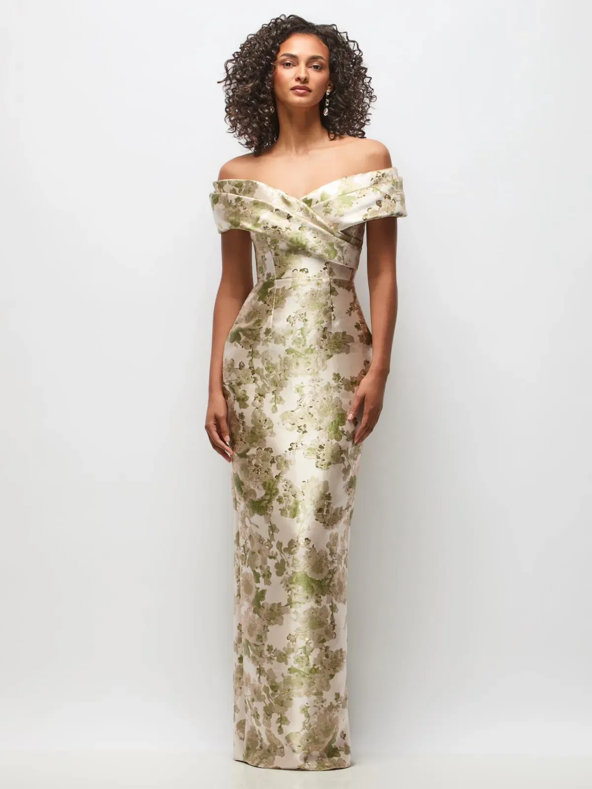 This luxe floral jacquard maxi dress elevates a sleek silhouette into wearable art. The draped off-the-shoulder wrap bodice frames the neckline with sculptural precision, flowing into a column skirt with an effortless back slit. What makes it unforgettable: the shimmering, woven peridot and blush abstract floral jacquard that catches the light with every step. Structured yet fluid, this floral dress seamlessly blends modern edge with a hint of opulence, transforming classic lines into something truly extraordinary.