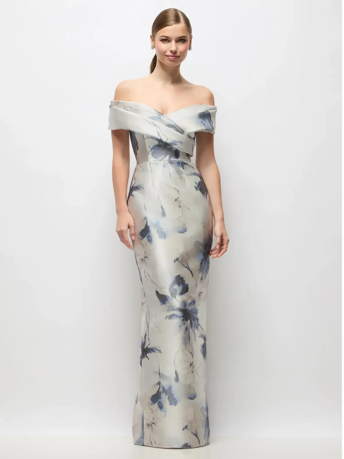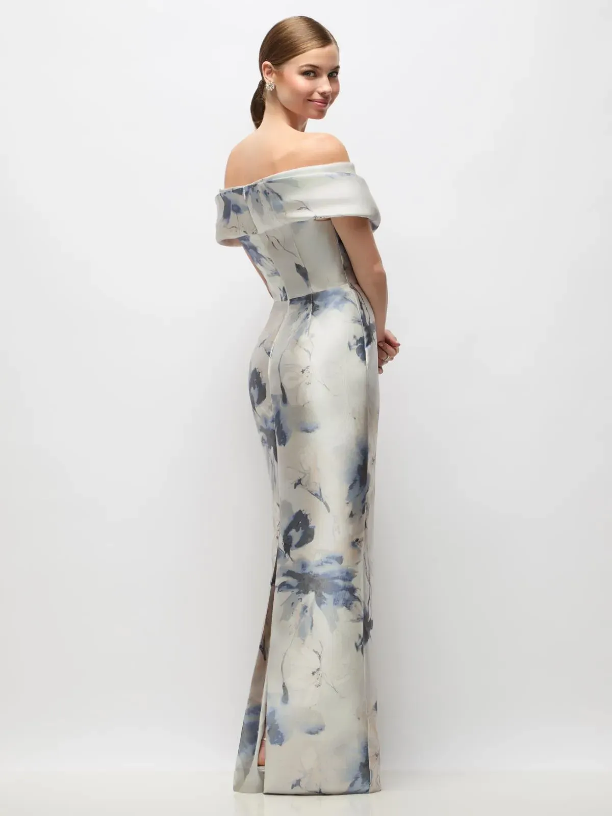 This radiant floral satin maxi dress redefines statement dressing. The draped off-the-shoulder wrap bodice brings sculptural drama, while the sleek column skirt with a back slit keeps the silhouette razor-sharp. What sets it apart: the oversized florals layered across glossy satin twill, creating a bold blend of form and artistry. This floral dress is structured, striking, and blooming with modern glam.