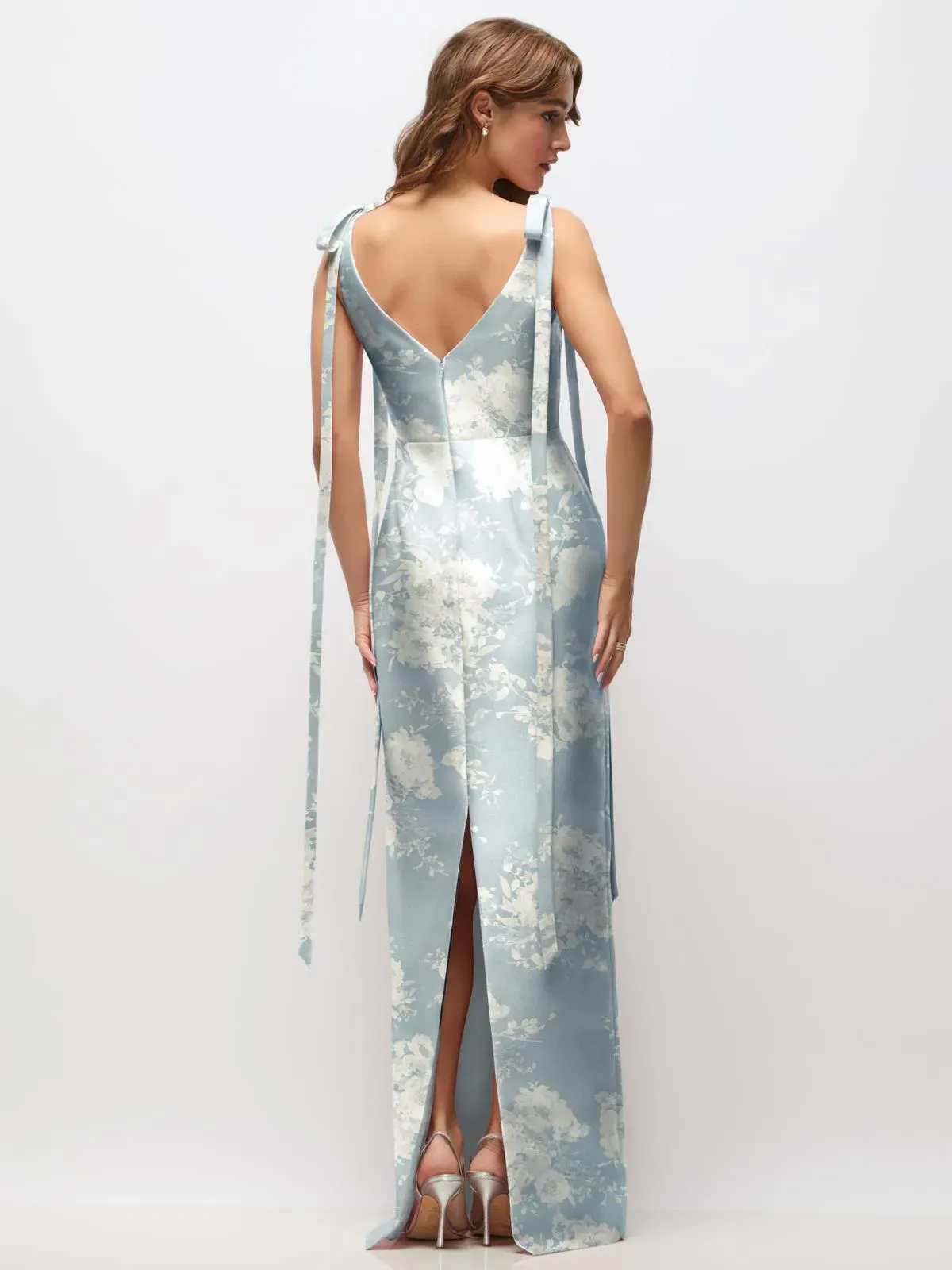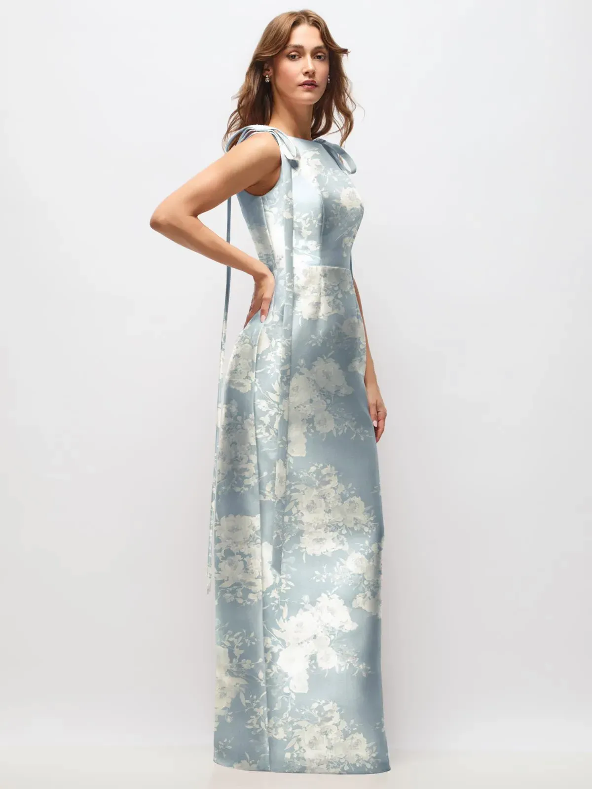 This floral satin maxi dress blends clean-lined structure with an artistic edge. Sculpted with a bateau neckline and a striking V-back, the silhouette stays neat and flattering, while the column skirt and back slit bring effortless movement. The floral print feels timeless yet unexpected, adding depth and richness to the minimalist design. At the shoulders, pre-tied bows with long, dramatic tails deliver a couture-like finish. Minimalist in shape yet striking in detail, this floral dress transforms bold blooms into a modern glam statement.