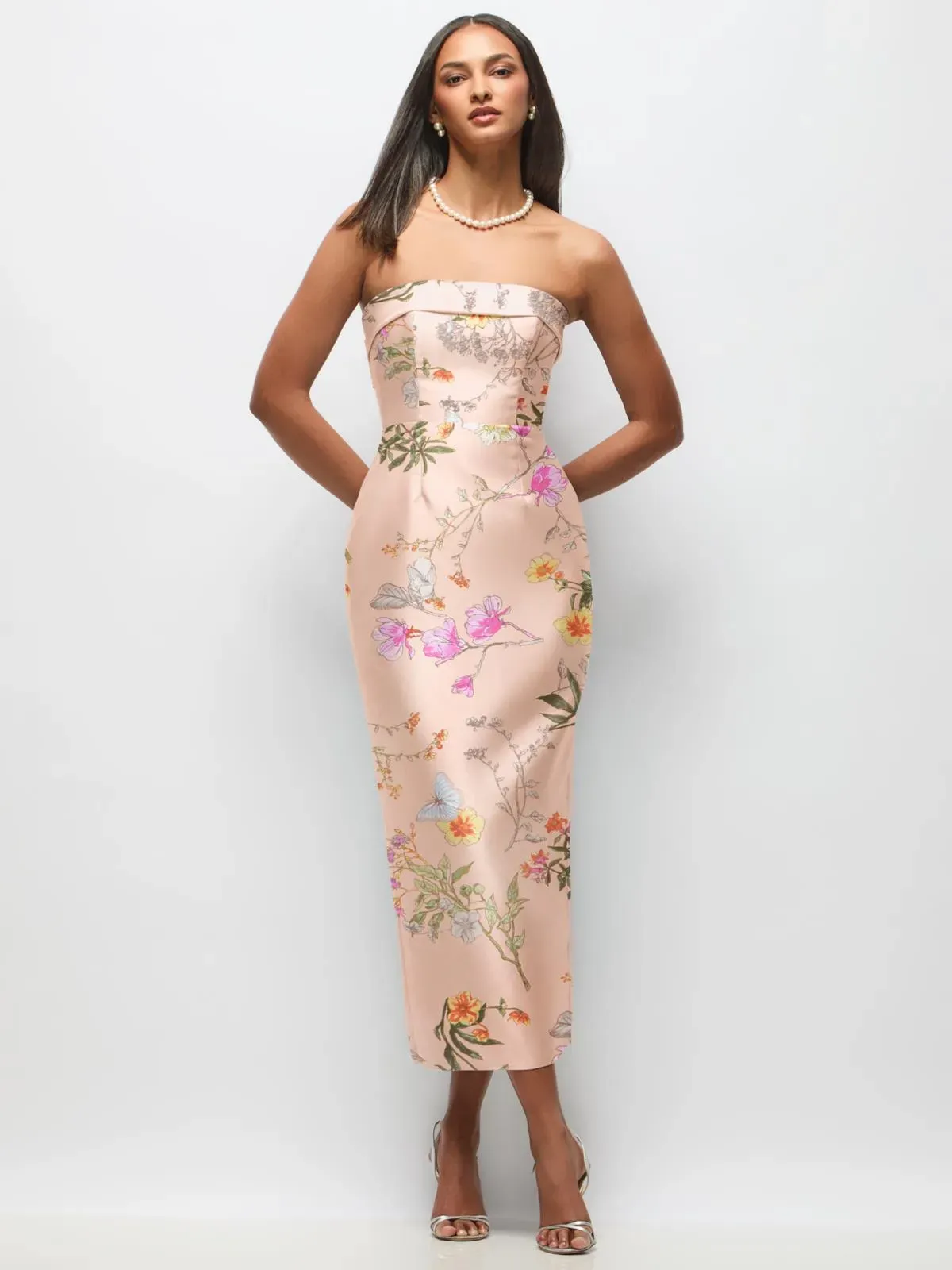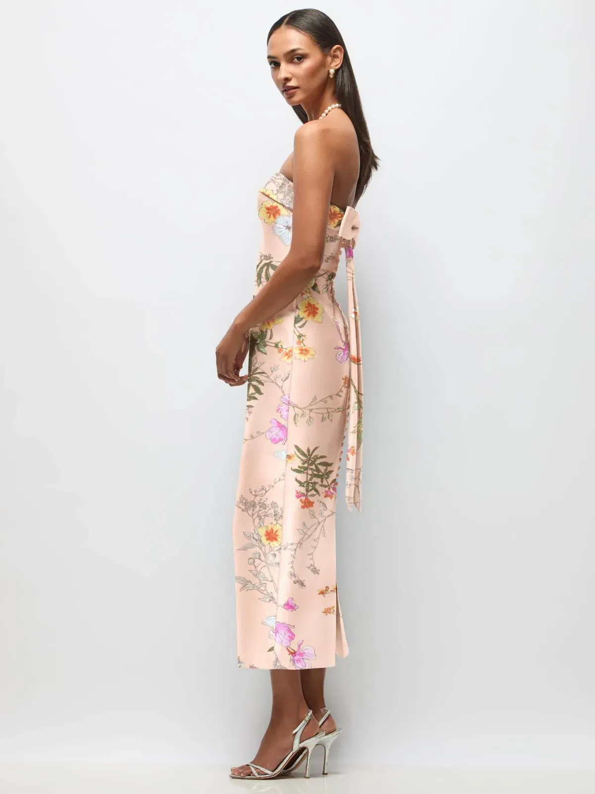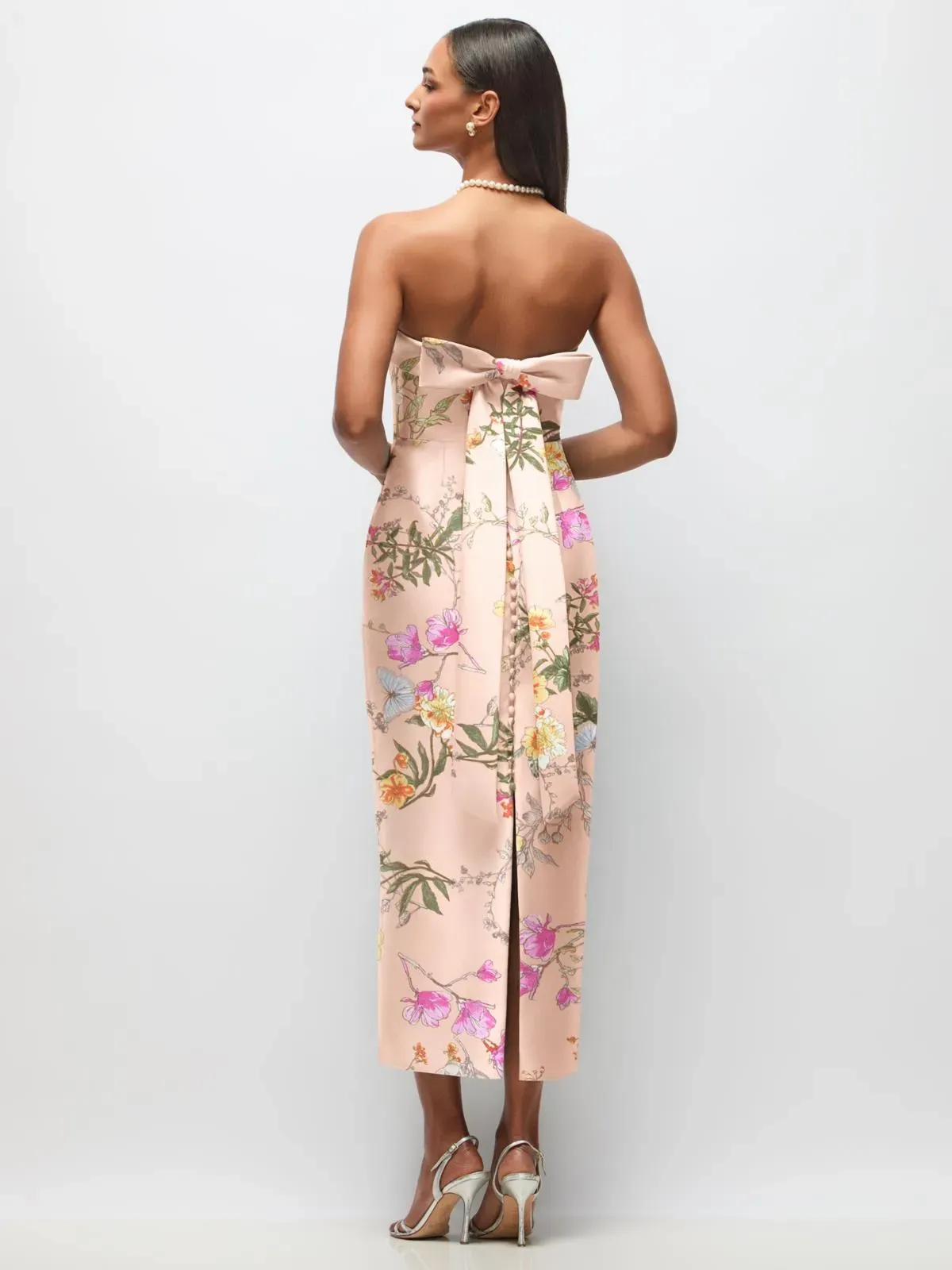 This tea-length floral satin dress strikes the perfect balance of structure and artistry. The strapless cuff neckline gives a sculpted, modern edge, while the column skirt keeps things sleek. In back, the pre-tied bow with its flowing tails cascades over a trail of covered buttons and finishes with a clean back slit for easy movement. The chic blooms infuse the luxe satin twill, giving this floral dress a fresh, romantic energy.