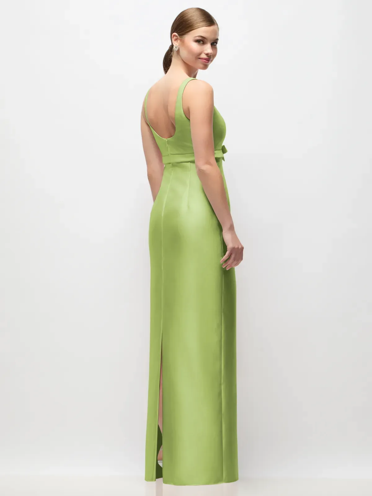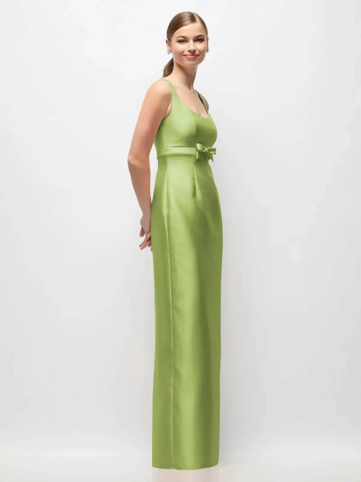 This satin twill maxi dress captures sleek sophistication with a vintage nod. Designed with a soft scoop neckline and empire waist, it elongates the silhouette for an effortlessly chic look. The bow detail at the center front adds a feminine spark. Finished with a clean column skirt and center back slit, this satin maxi dress blends timeless polish with a modern edge.