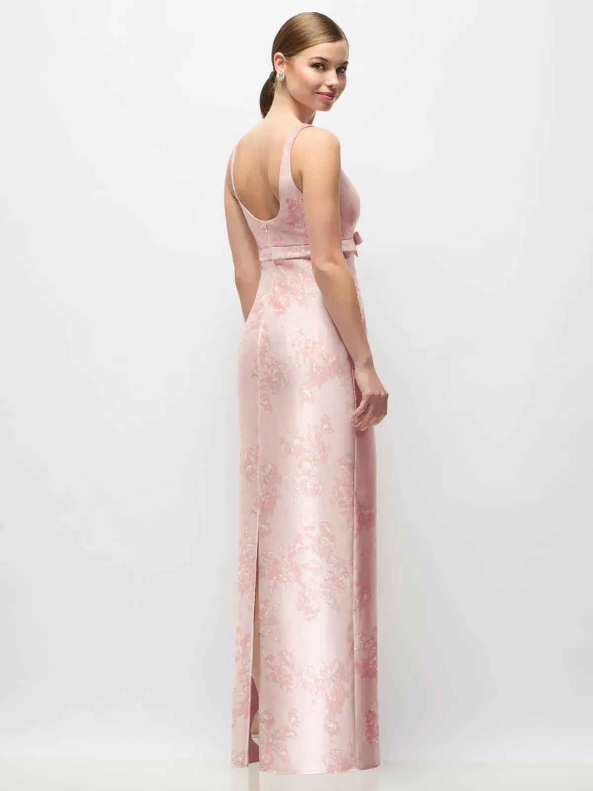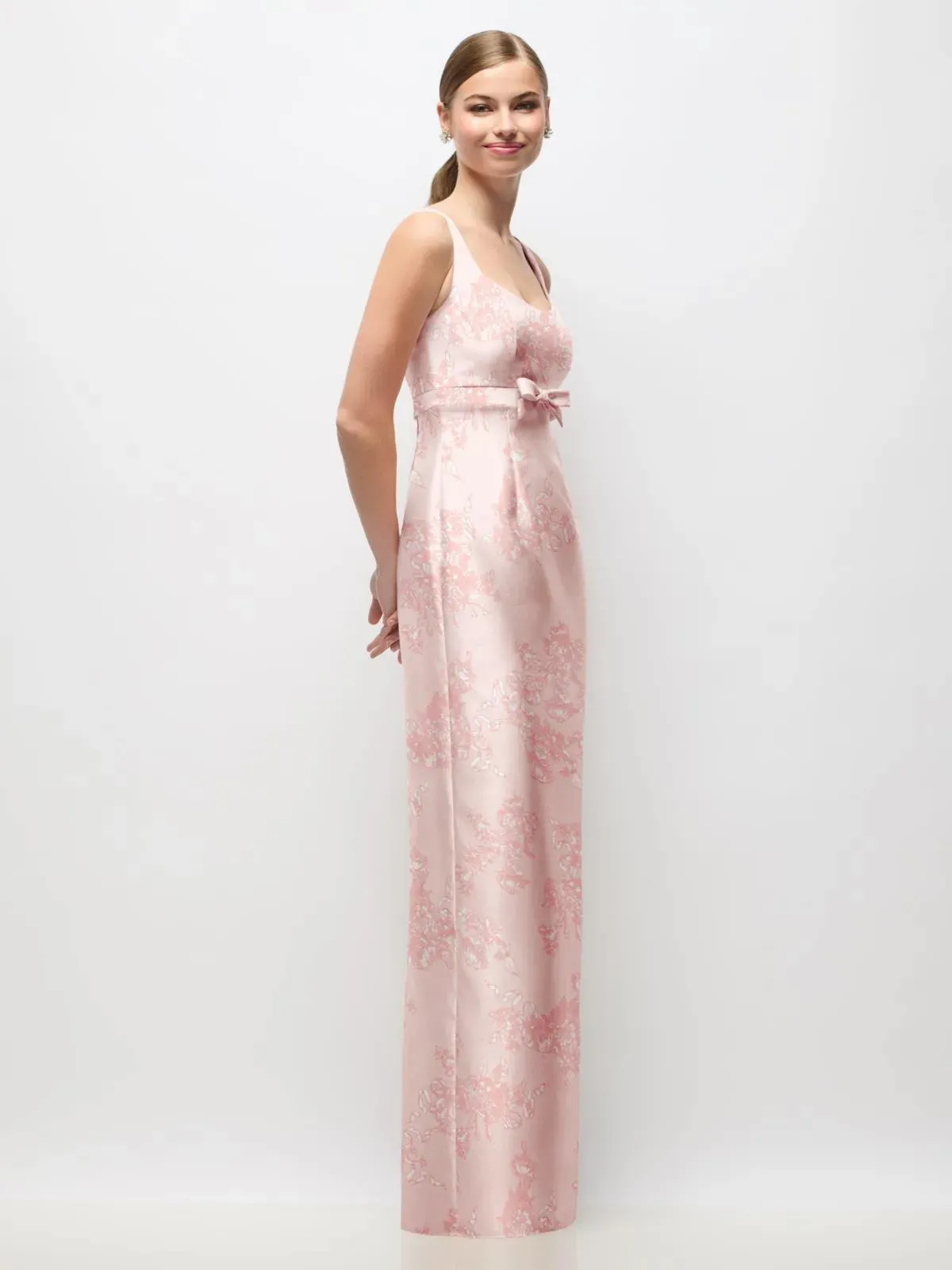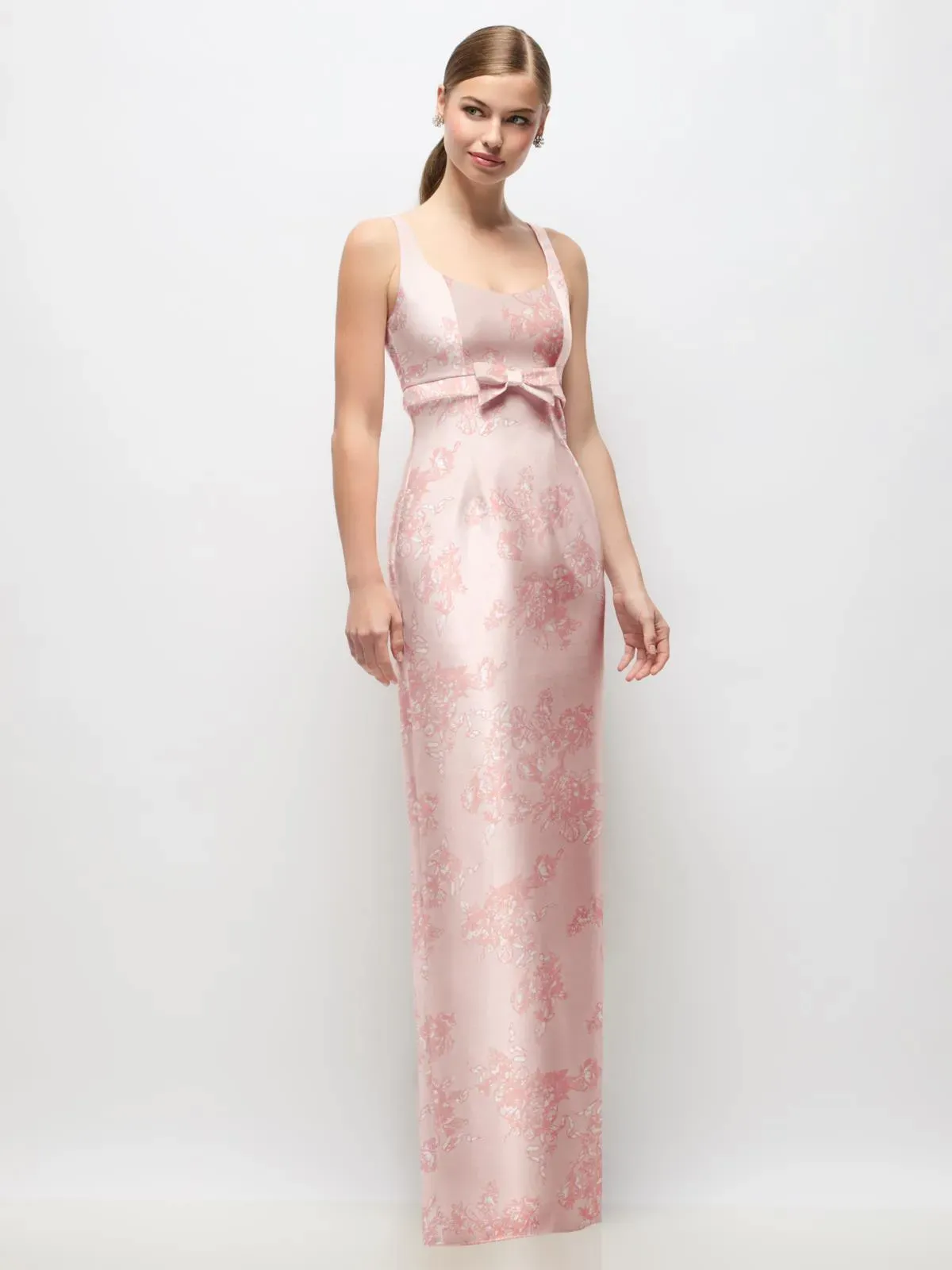 This floral satin maxi dress brings a fresh, romantic twist to sleek simplicity. The scoop neckline and empire waist create a flattering silhouette, complete with a tailored, feminine bow at the front waistband. The smooth floor-length column skirt features a center-back slit for freedom of movement. Crafted in a luminous, flowered satin twill, this floral dress blends clean, modern lines with a vintage-inspired charm that feels both effortless and unforgettable.