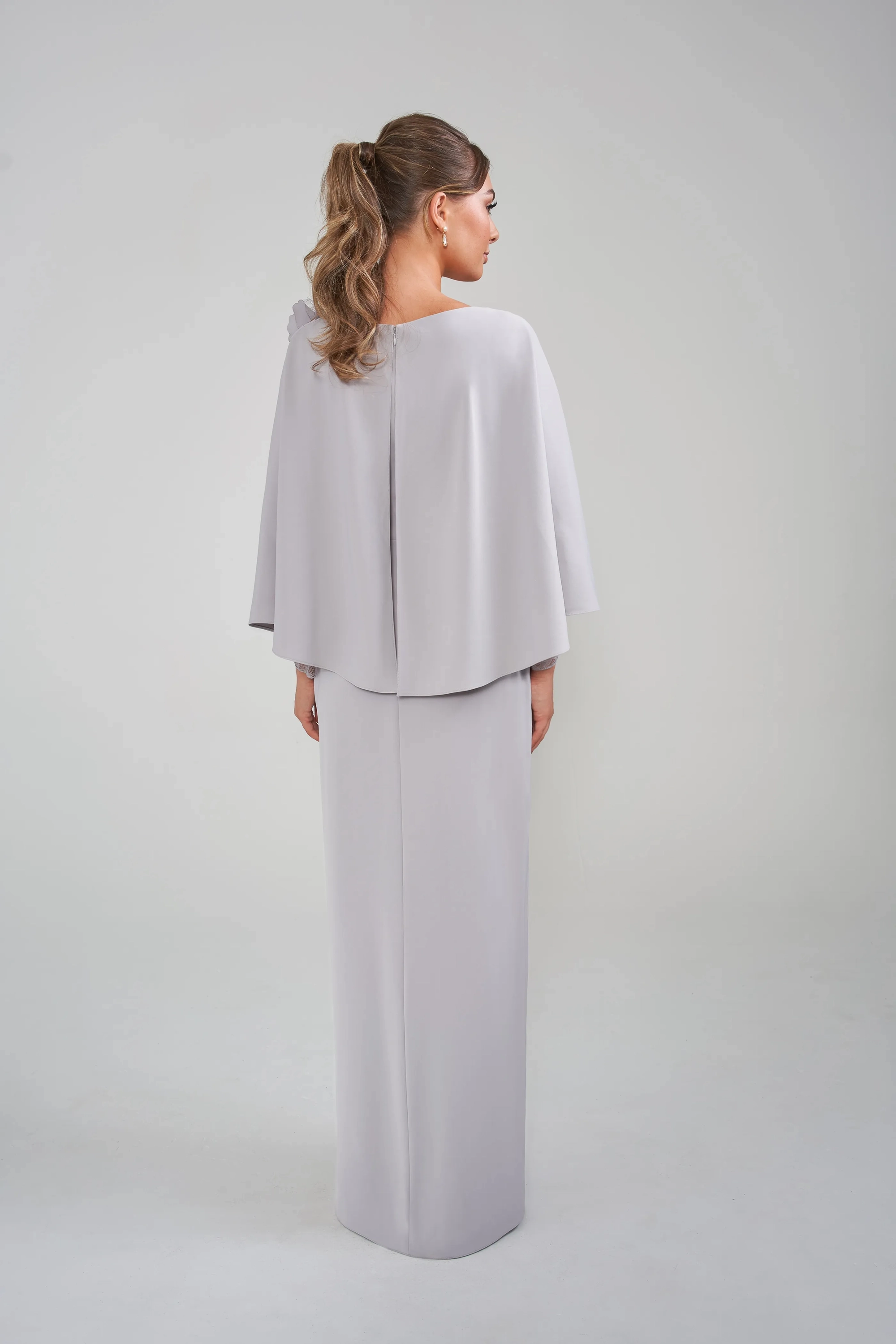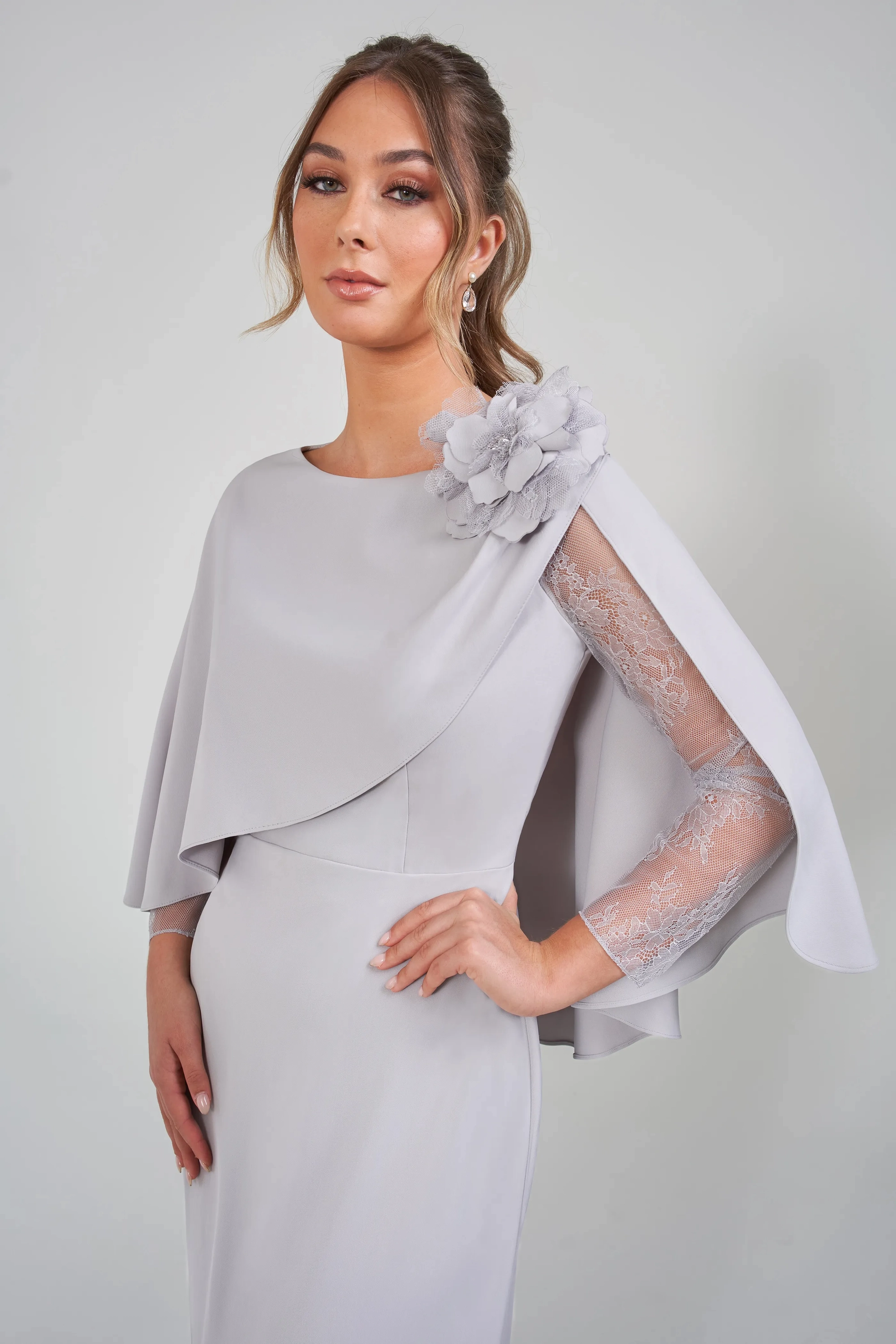 Designed in luxurious Royal Crepe, this gown blends effortless charm with modern style. A boat neckline and delicate lace sleeves peek beneath a flowing cape, gathered at one shoulder with a sparkling beaded flower. The natural waist flatters every figure, while a sleek sheath skirt with a side slit adds movement and flair. Perfect for the Mother of the Bride who wants to feel radiant, confident, and ready to celebrate in unforgettable style.
