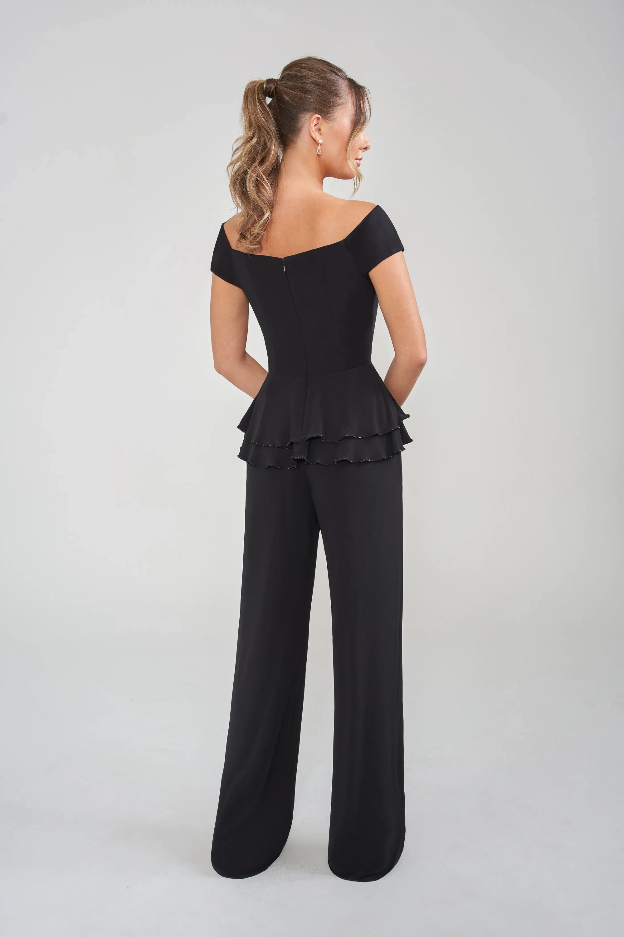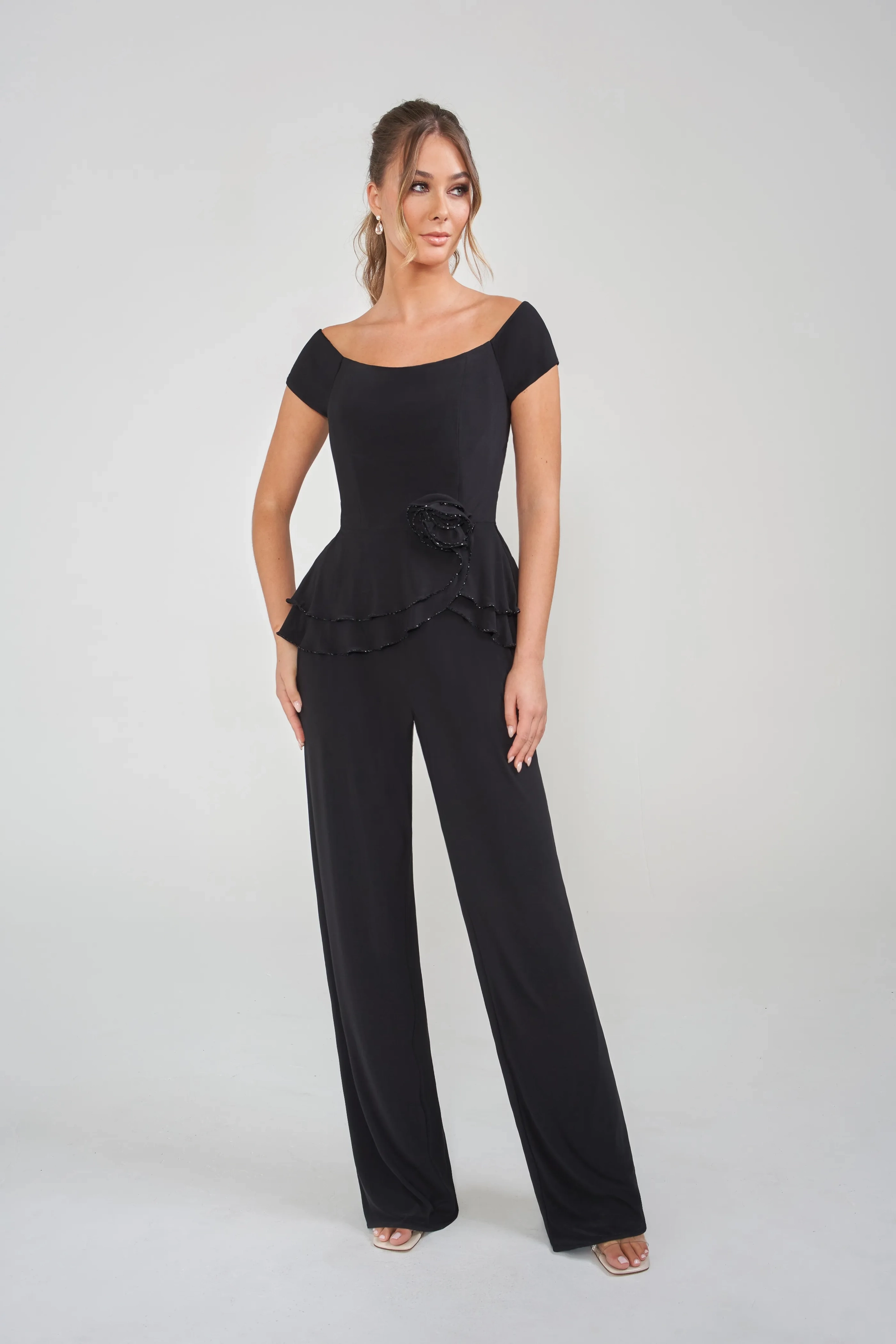 This stunning Matte Jersey jumpsuit blends modern elegance with playful charm and all-day comfort. A flattering off-the-shoulder neckline highlights your silhouette, while soft, stretchy fabric moves effortlessly with you. Hand-beaded trim on the ruffled peplum and a delicate flower at the waist add sparkle and femininity. Paired with a flowing shawl for added drama, it's the perfect choice for the vibrant, young mom who wants to shine with confidence and ease at any celebration.