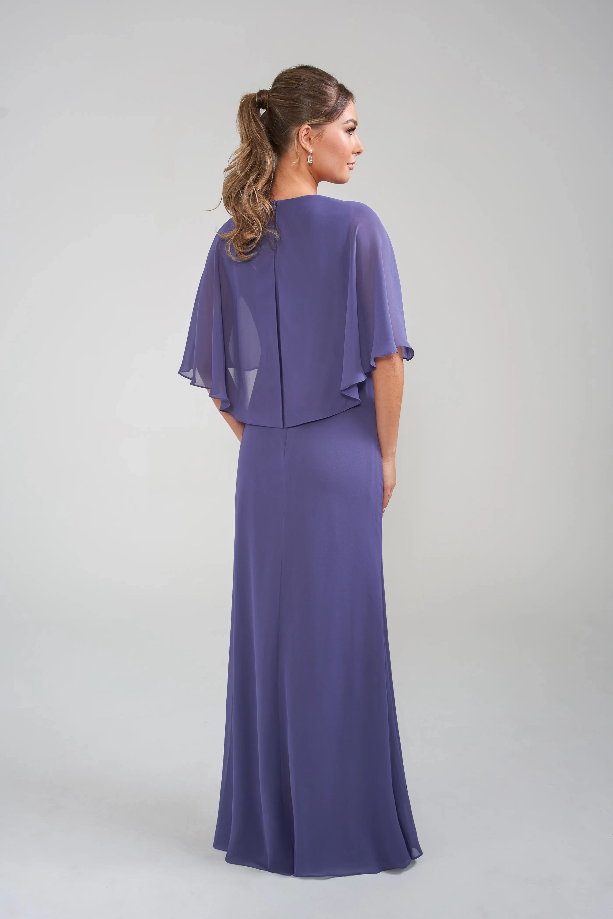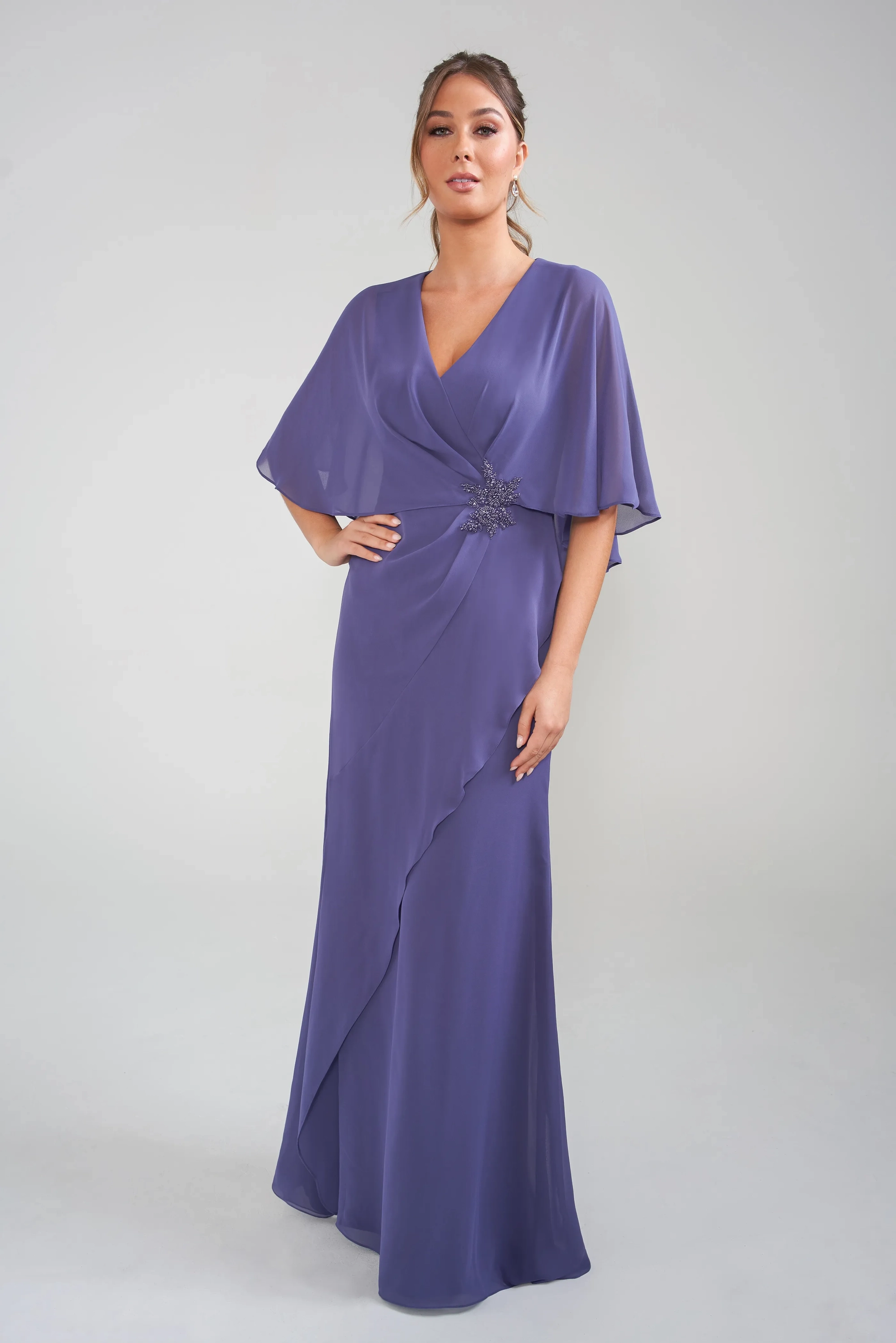 This gown, crafted from soft Jade Chiffon, offers style and comfort for every size. Featuring a flattering V neckline that frames the décolletage and a draped flutter cape for graceful arm coverage, it moves effortlessly. A sparkling beaded applique at the waist highlights the natural silhouette, complemented by gentle gathers. The flared skirt flows elegantly with a delicate ruffle detail, adding romantic flair—ideal for a mom seeking stunning comfort all day.