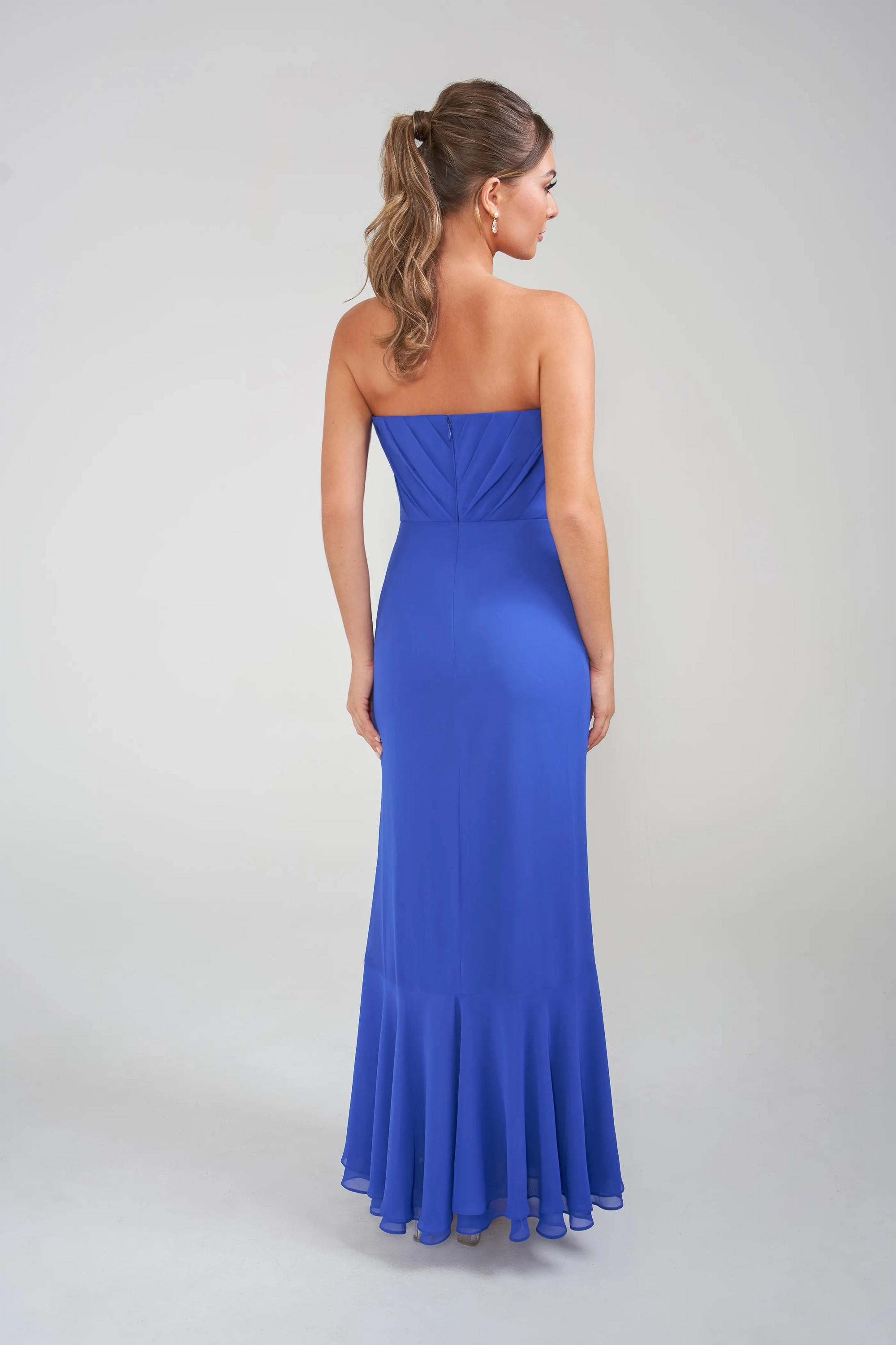 This strapless Jade chiffon gown is fresh, flirty, and full of movement, bringing major party energy. The pleated bodice fits perfectly, with a playful flower detail at the waist adding charm. A high-low ruffle hem and cascading front create a twirl-worthy vibe, ideal for dancing all night. Its soft flare silhouette and breezy elegance make it perfect for a fun-loving spirit seeking effortless style and unforgettable moments.
